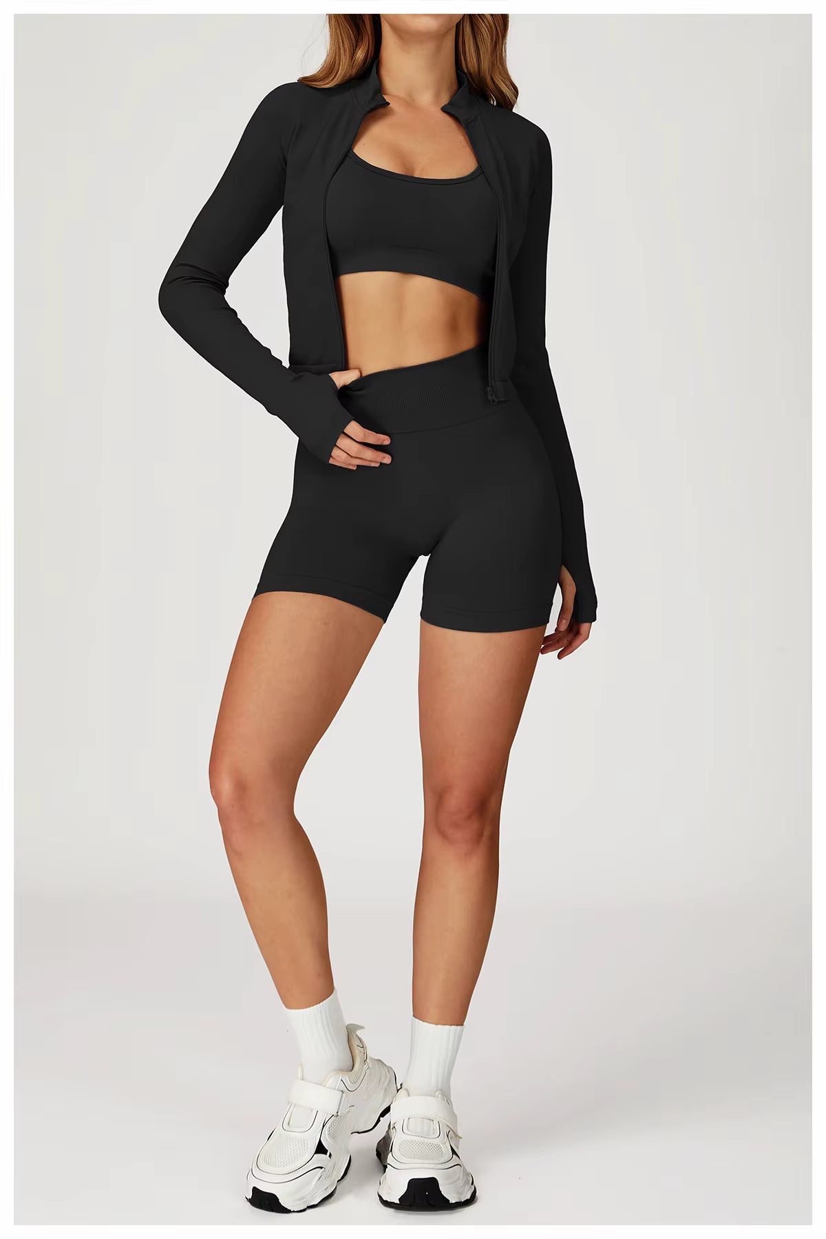 Black / M(8) / 3-Piece Set – Top + Jacket + Shorts - $29.99 USD